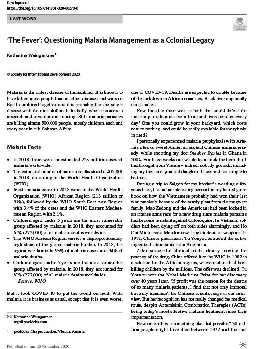 Covid-19 has put the world on hold. But with Malaria, which has killed more people than all other diseases and wars on Earth combined, it ́s business as usual, or even worse: Deaths are expected to double due to the lockdown in African countries. The Fever portrays the fight against malaria in East Africa as a case study in greed, courage and self-determination. After the movie screening panel discussion with Louise Deininger (African Conceptual Artist, Author, Leadership Coach), Dr. Sheron Dzoro (Medical Scientist) and Katharina Weingartner (Director THE FEVER). Moderator: Otalia Sacko. Editor OKTO: Shoshana Rae Stark